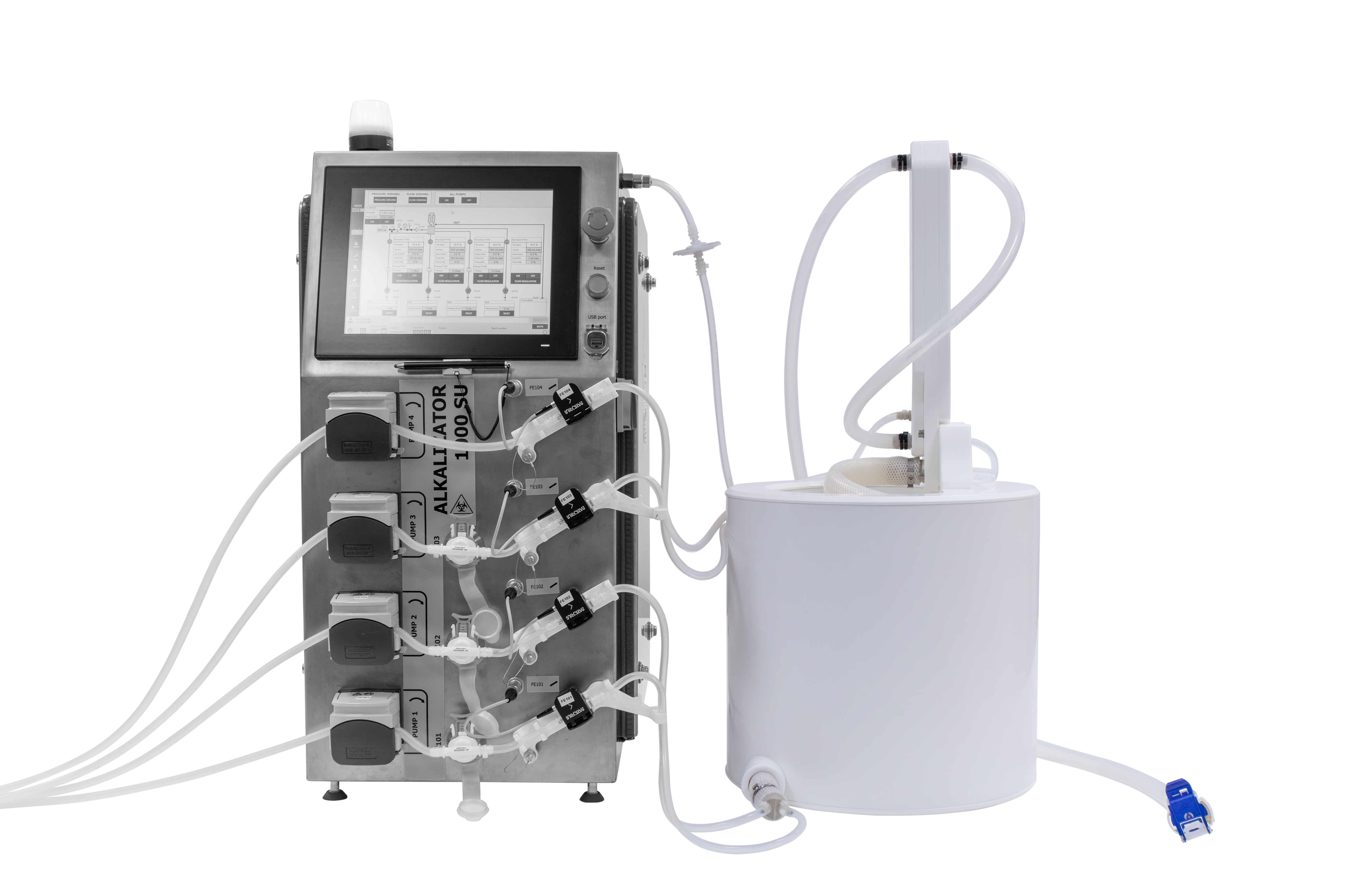 The Lysis Reactor is a single-use component to use in combination with the In-line Lysis System’s Tower. Together they form fully automated in-line lysis system with a closed single-use loop for process development (PD) up to pilot scale. The Lysis Reactor is a single use component with simple installation, requires little countertop space and provides a clean and simple alternative to larger batch lysis processes allowing user to use it as a plug and play combination. It consists of the main reactor body with a fixed volume of 5000 mL, 5 inlet paths (4 solutions and one air) and an outlet path.